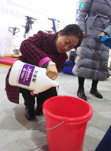 (图四:将加迪斯高泡地毯水注入水桶与一定比例的水混合)